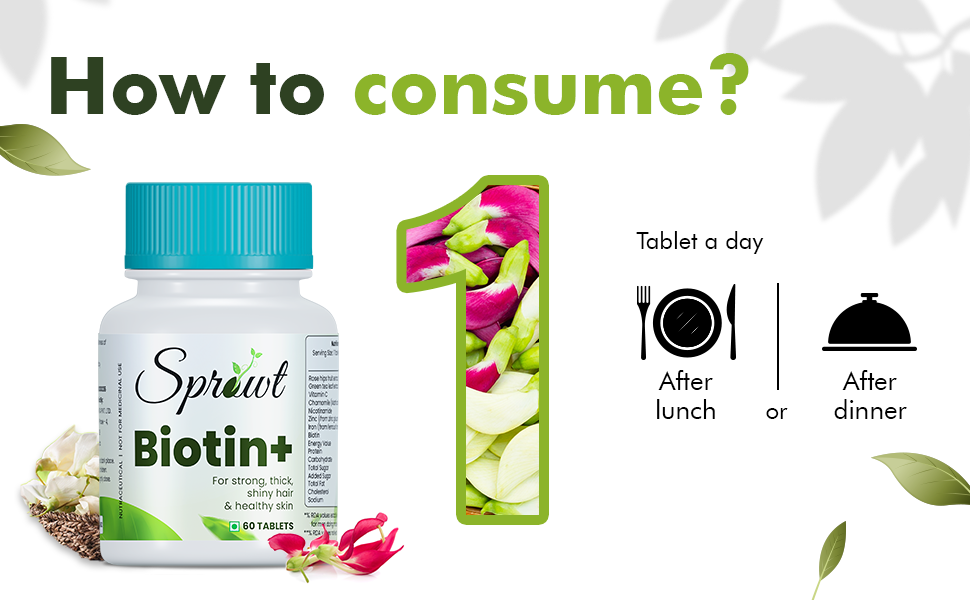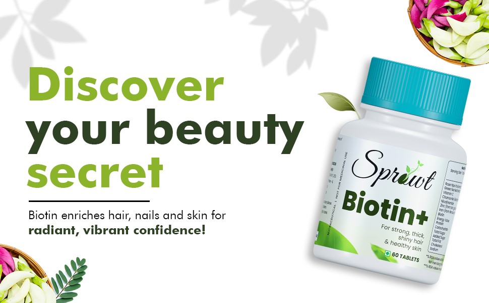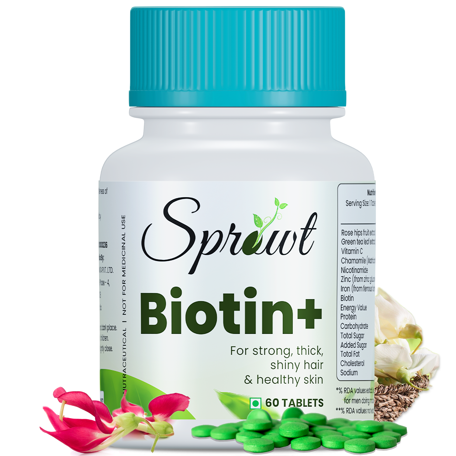 Sprowt Biotin + Tablet | Supplement For Strong Thick Hair & Glowing Skin | Improve the Energy Level | With Vitamin C, Green tea, Rosehip Extracts | Men & Women | 60 Biotin Veg Tablets