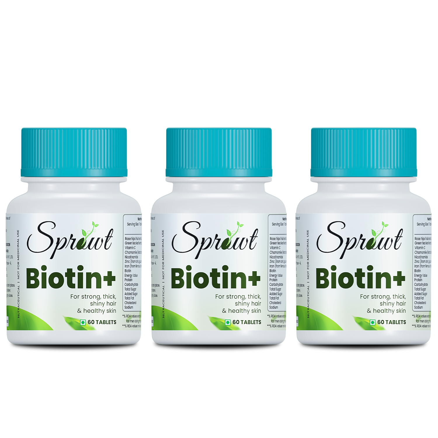 Sprowt Biotin + Tablet | Supplement For Strong Thick Hair & Glowing Skin | Improve the Energy Level | With Vitamin C, Green tea, Rosehip Extracts | Men & Women | 60 Biotin Veg Tablets - Pack of 3