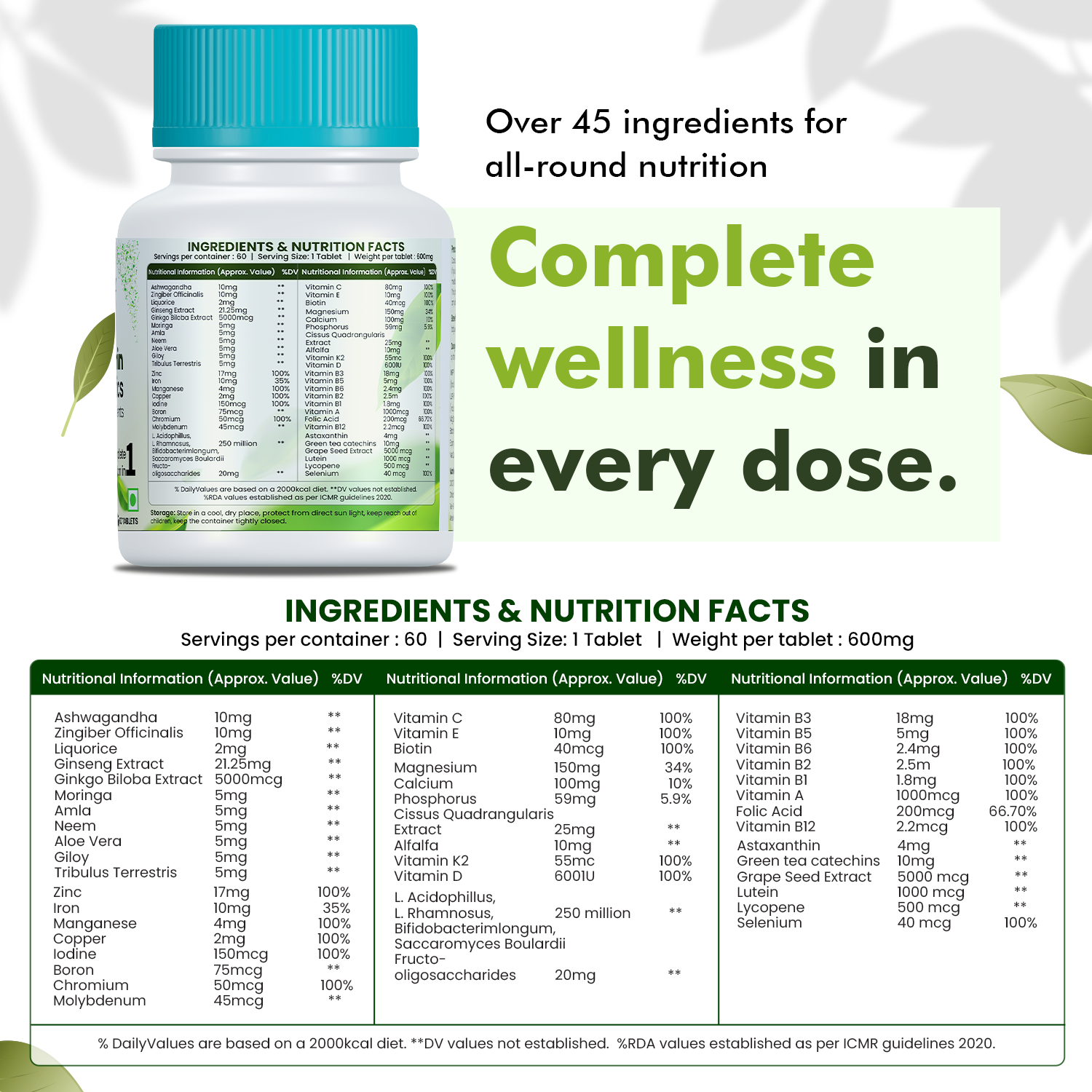 Sprowt Multivitamin with Probiotics having 45 essential ingredients: Enhanced Energy: Sprowt Multivitamin with Probiotics combines 45 essential nutrients to combat fatigue and weakness effectively, promoting sustained energy levels throughout the day. Improved Gut Health: Probiotics in the formula support a healthy gut microbiome, aiding digestion, nutrient absorption, and reducing gastrointestinal discomfort. Vital Nutrient Support: This comprehensive multivitamin delivers a wide range of vitamins and minerals, addressing deficiencies that can contribute to fatigue and weakness. Immune Boost: The multivitamin's immune-boosting ingredients help protect against illnesses, reducing the risk of feeling weak due to infections.