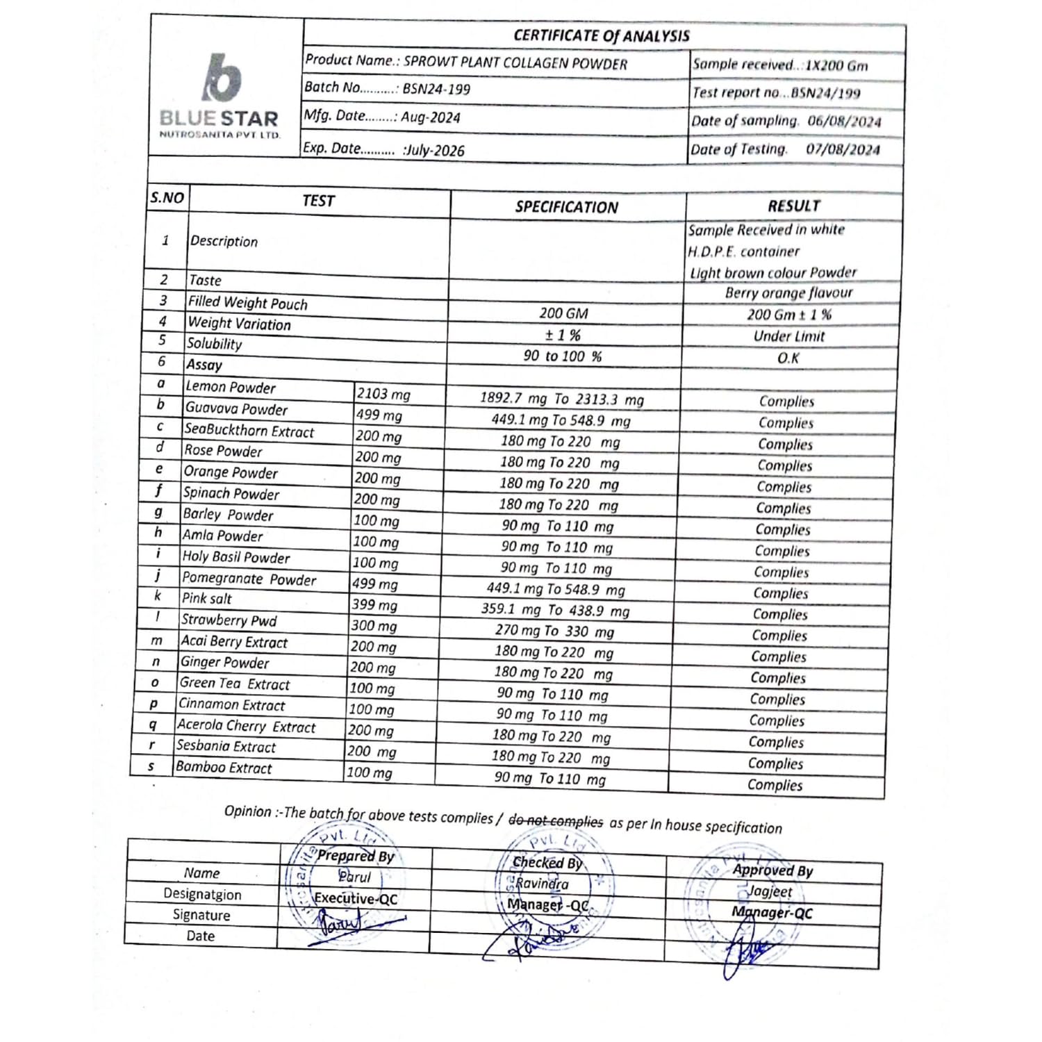 - Ingredients: Lemon Fruit, Guava Fruit, Sea Buckthorn Fruit Extract, Rose Petal, Orange Juice Fruit, Spinach Leaf, Barley Leaf, Amla Fruit, Holy Basil Leaf. Sprowt collagen is plant-based and rated as one of the best collagen supplements for skin.